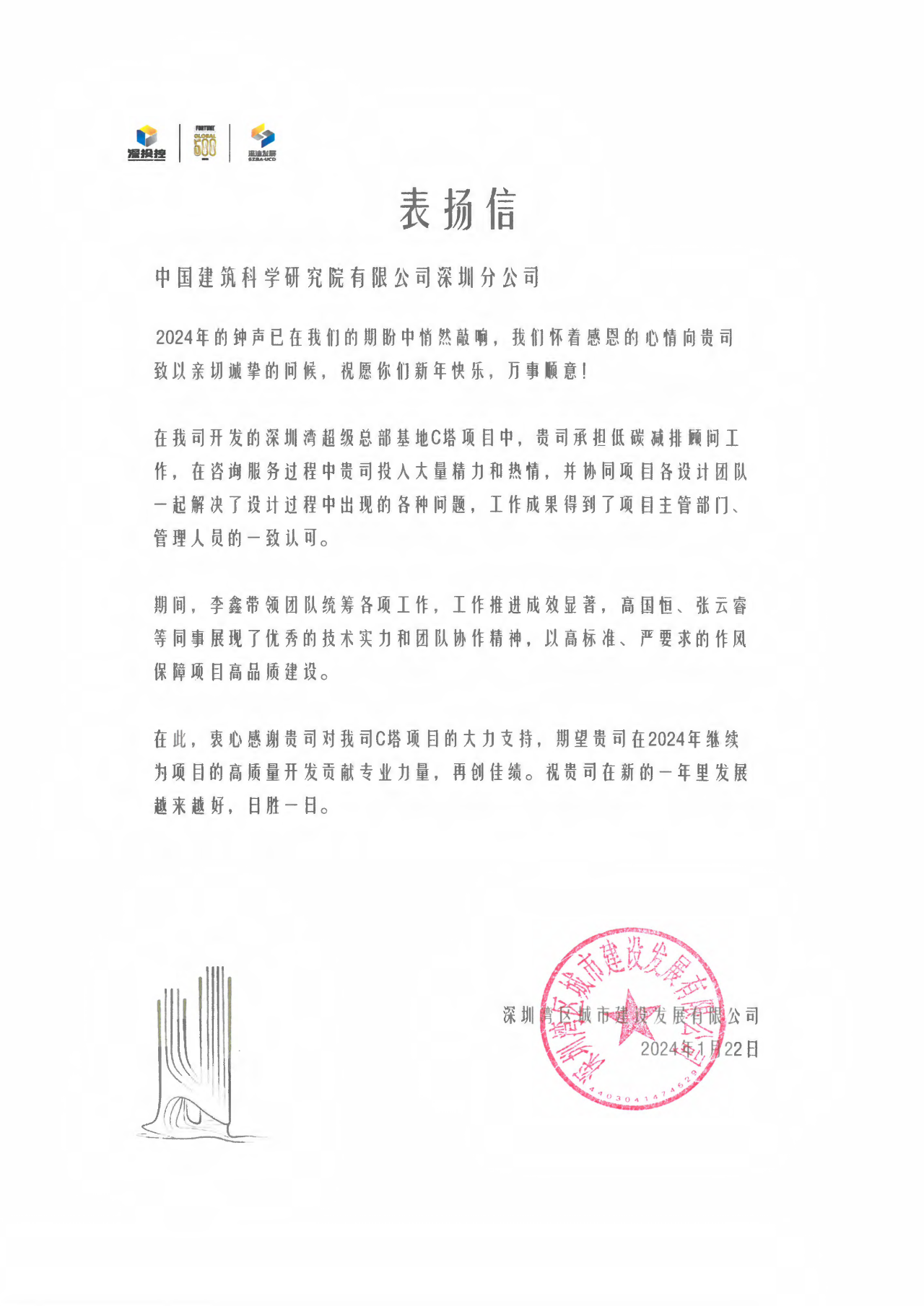 中國建研院深圳分公司收到深圳灣區(qū)城市建設發(fā)展有限公司表揚信