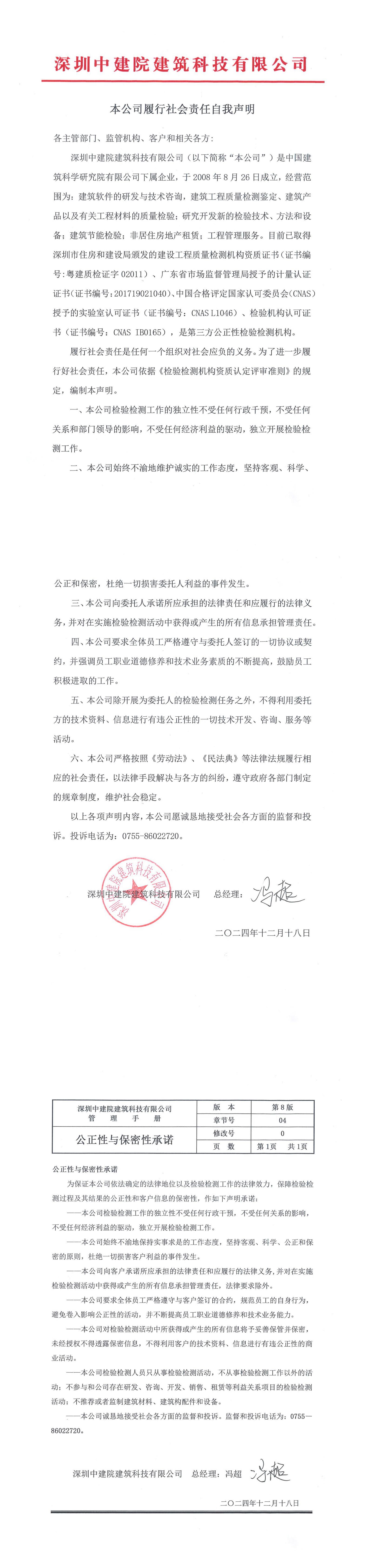 深圳中建院履行社會責任自我聲明、公正性與保密性承諾